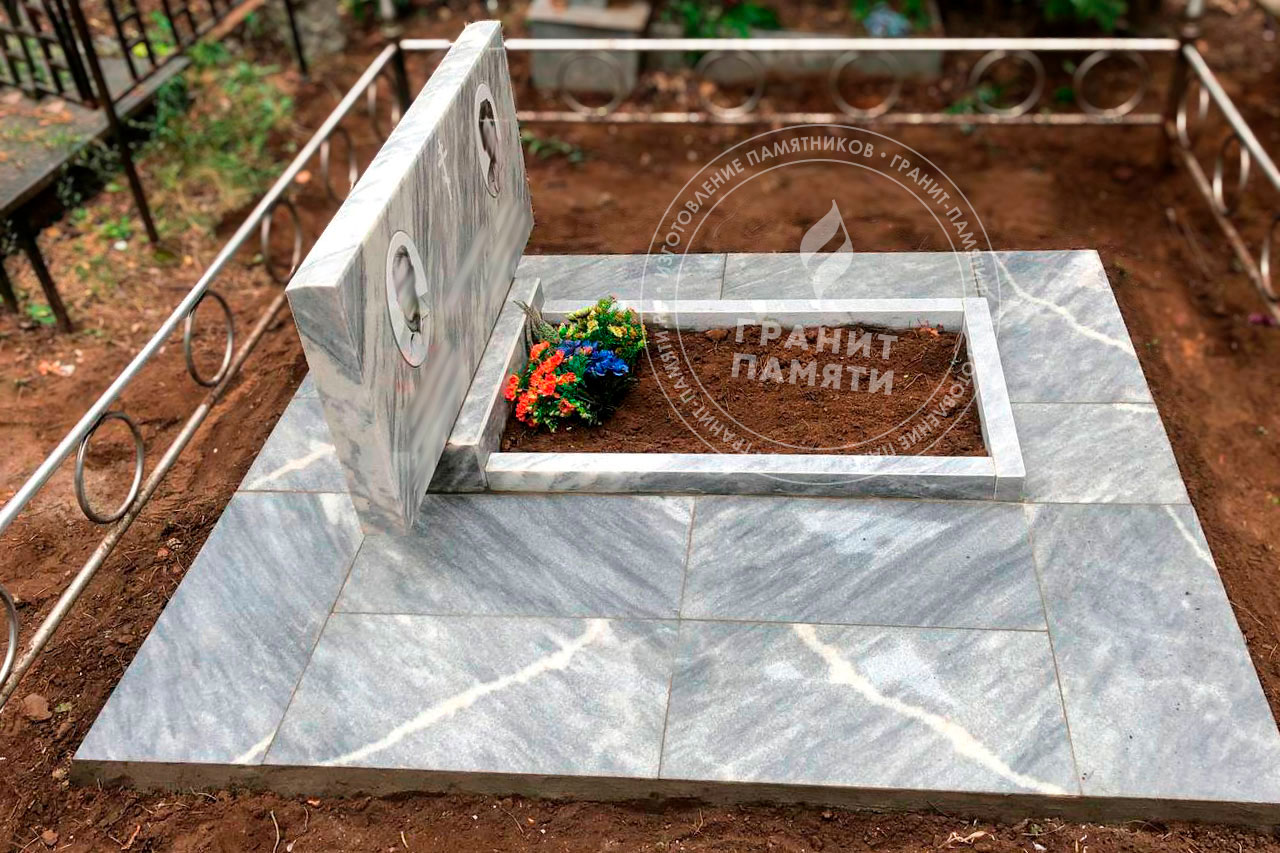 Мраморный памятник изготавливается из натурального мрамора Полевского месторождения — одного из самых известных и качественных российских мраморов. Этот благородный камень светло-серого цвета с характерным природным рисунком, обладает уникальной текстурой, которая подчеркивает торжественность и элегантность любого мемориального сооружения.
